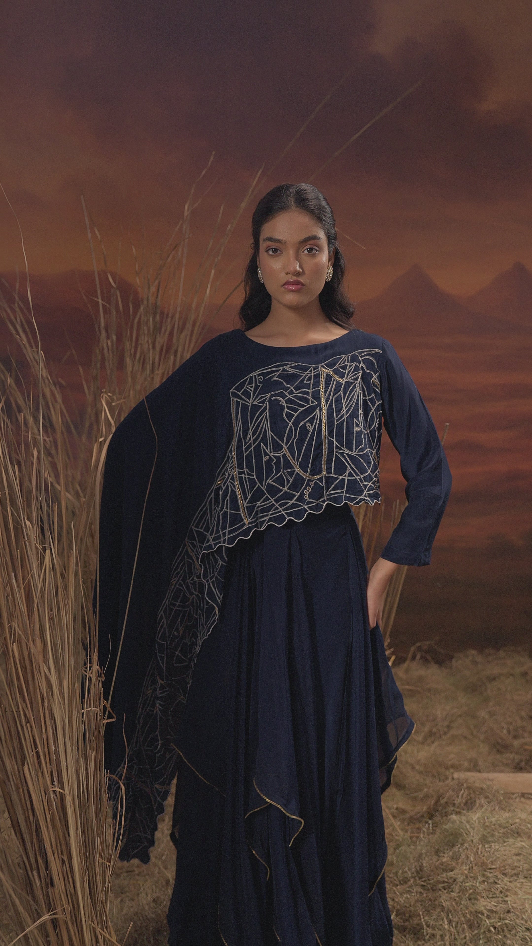 Paired with a draped, asymmetric Georgette Silk skirt that features layered pleats, offering volume and fluidity to the silhouette.