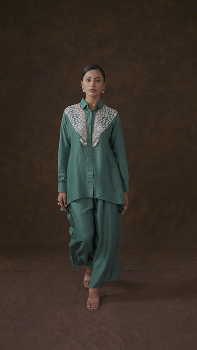Make a contemporary statement in this sophisticated Emerald Teal Co-Ord Set. This two-piece ensemble is crafted from luxurious raw silk, featuring a shirt with a modern, asymmetrical hem. The focal point is the elaborate hand-embroidered yoke, intricately adorned with contrasting threadwork, sequins, and delicate beaded tassels. The look is completed with comfortable, wide-legged pants.