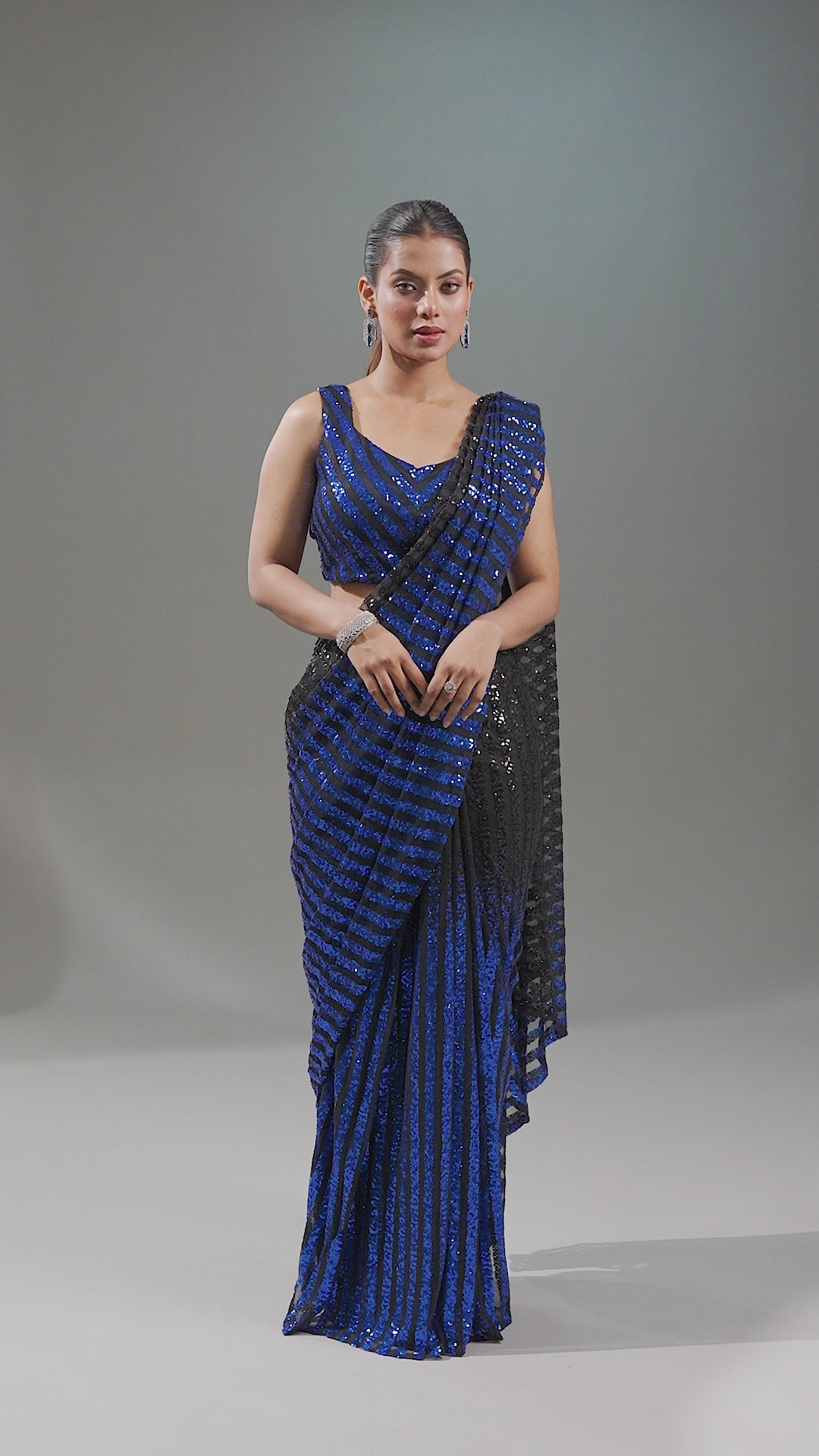 This elegant Blue saree, made from delicate net material, showcases glistening sequins that twinkle with each movement and reflect light for a mesmerizing effect. Paired with a coordinating blouse, it exudes a delicate and feminine charm, making it perfect for upscale weddings, evening receptions, or cocktail parties. Its translucent fabric drapes gracefully, enhancing your body's natural curves and radiating timeless elegance.