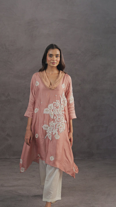 Add a touch of contemporary charm to your festive wardrobe with this Blush Peach Tie-Dye Asymmetric Kurta paired with elegant champagne pants. Perfectly balancing comfort and style, this ensemble is detailed with delicate handwork and a chic silhouette.