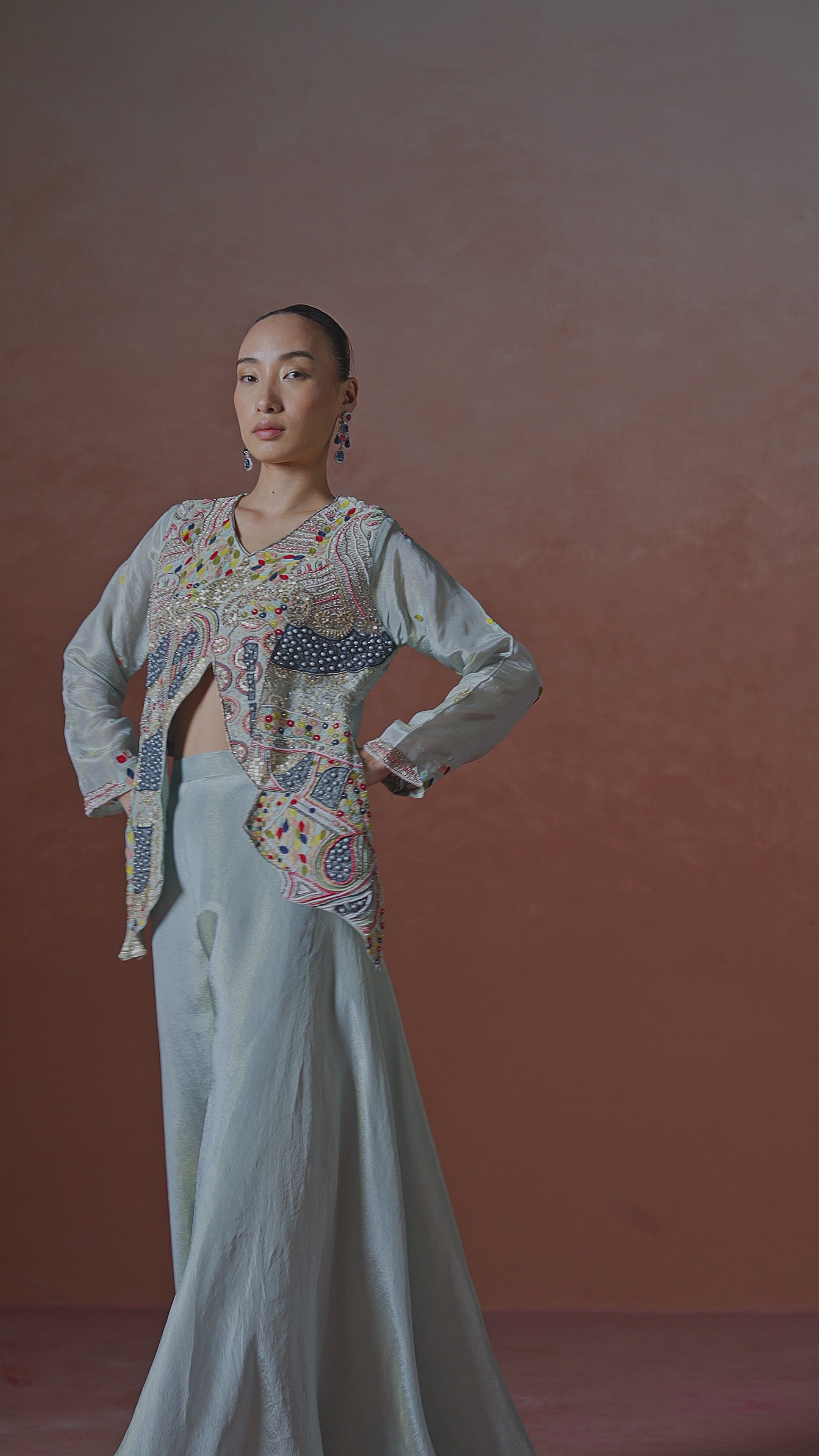This contemporary ensemble features a structured ice blue jacket adorned with intricate multicolored threadwork and mirror embellishments. Paired with wide-leg palazzo pants in a soft silk-blend fabric, it exudes modern elegance. The front-slit design adds a bold touch, enhancing the overall silhouette. Ideal for festive occasions, cocktail evenings, or statement celebrations. A refined fusion of tradition and contemporary flair.