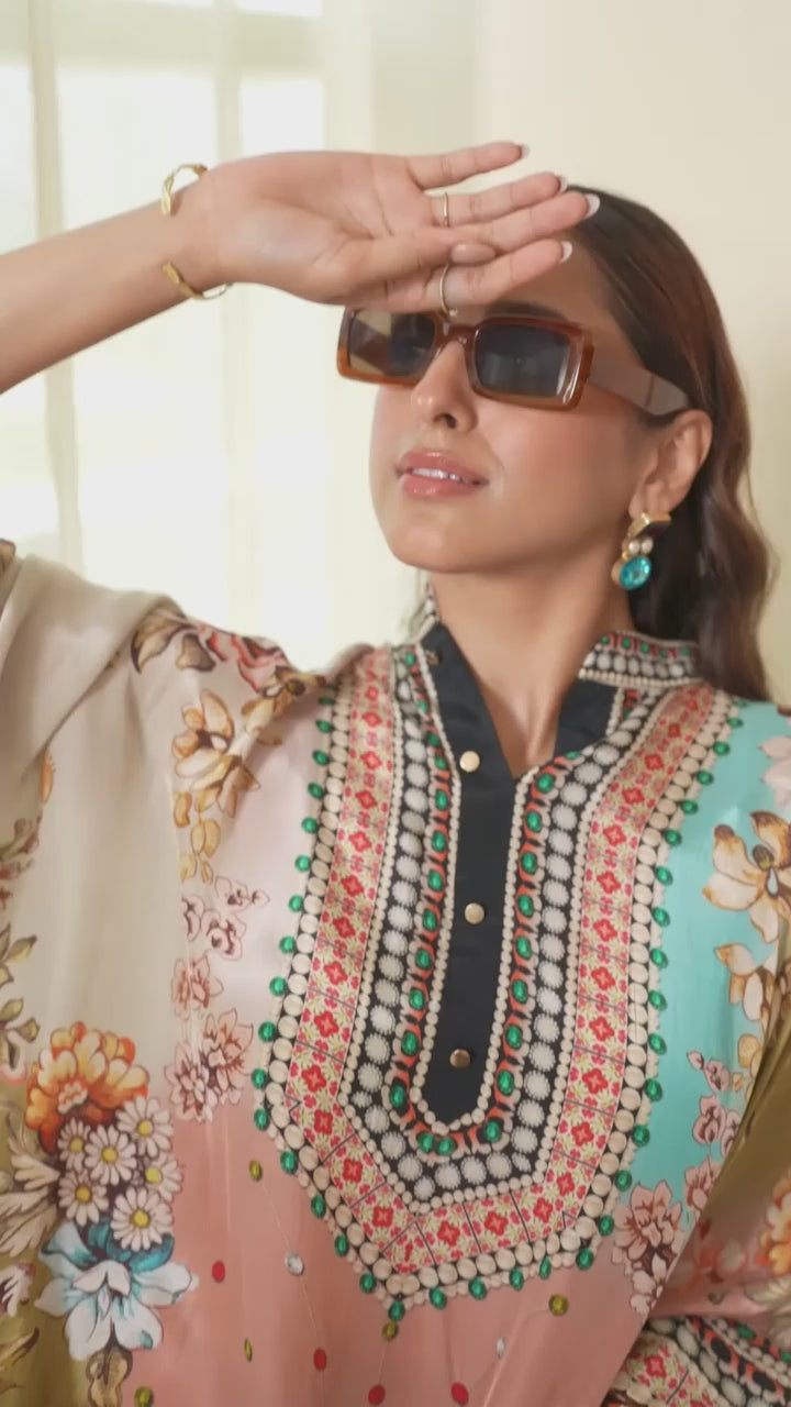 This boho-chic set combines vibrant prints with soothing hues for a look that’s both lively and laid-back. It includes a flowing kaftan paired with coordinating pants, showcasing striking borders and delicate floral patterns that capture your adventurous spirit. Ideal for sipping coffee by the shore or strolling barefoot in the sun.