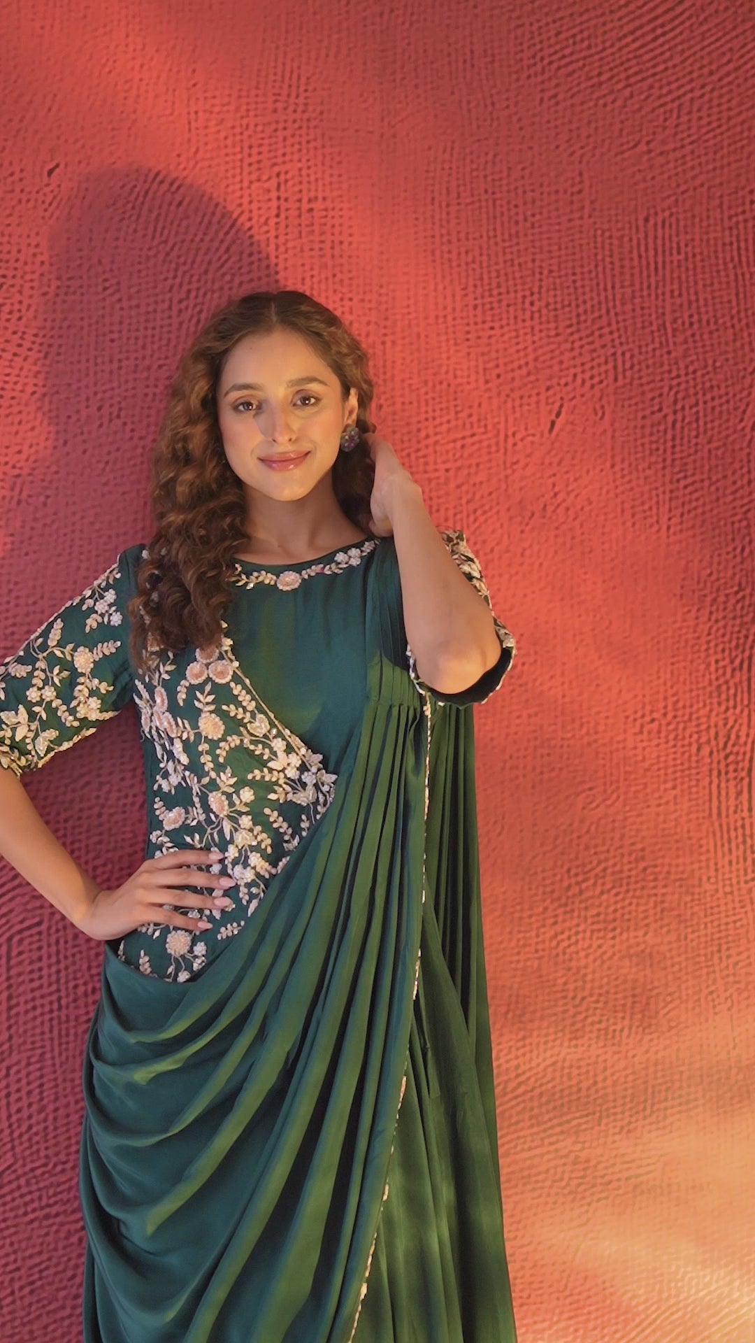 The combination of padded draping and an attached jacket adds a unique silhouette, while the intricate handwork with sequins, cut dana, beads, aari, and zari brings a touch of elegance and artistry. The matching habutai silk drape fall would definitely elevate the overall look, making it perfect for semi-formal events.