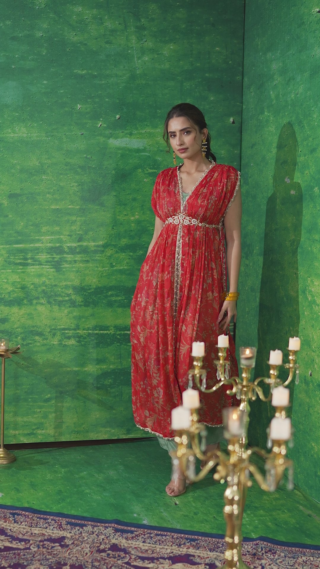 Introducing our Bright Orange Printed Chinon Silk Kaftan Set. This eye-catching ensemble features a beautifully styled kaftan kurta, delicately adorned with intricate sequin and pearl handwork. It includes a matching crop top and a stunning green palazzo, making it an ideal choice for semi-formal occasions. Elevate your wardrobe with this vibrant and sophisticated outfit that effortlessly blends comfort and style.