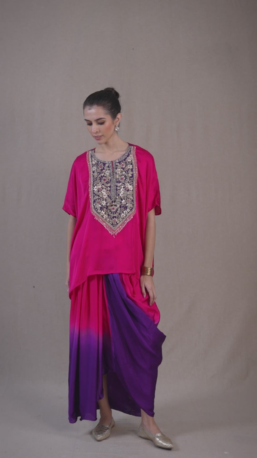 Introducing our Bright Pink Ombre-Dyed Purple Satin Silk Kaftan & Skirt Set. The kaftan features intricate handwork with sequins, zari, beads, and cut dana, adding a touch of elegance. It is paired with a matching draped skirt, creating a seamless and stylish look. Perfect for semi-formal occasions.
