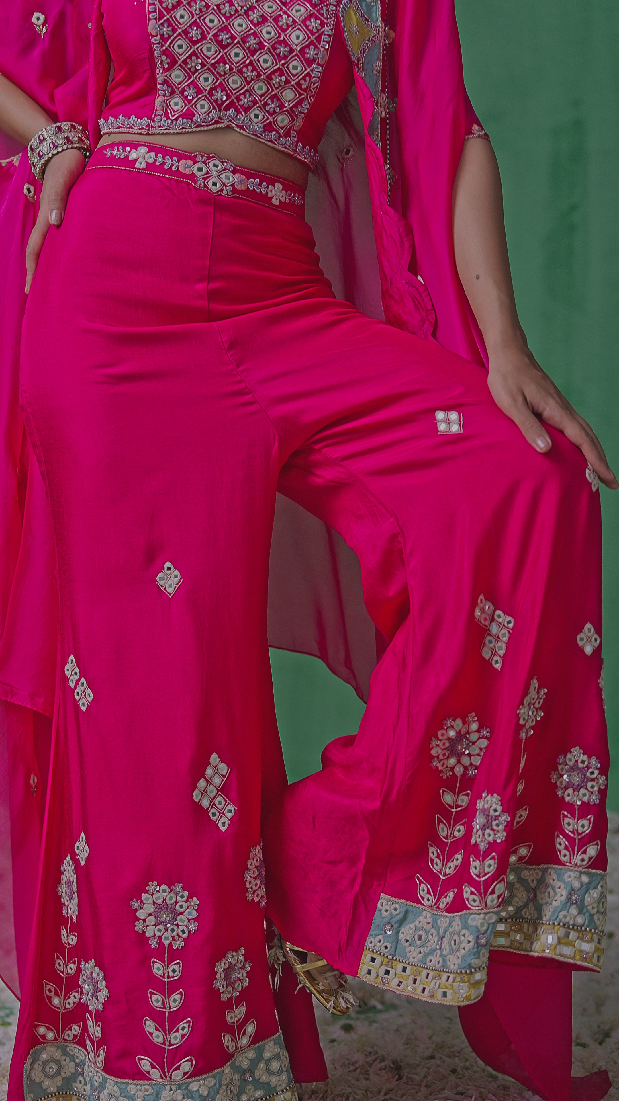 Bright Pink Embellished Padded Crop Top With Palazzo and Complimenting Shrug