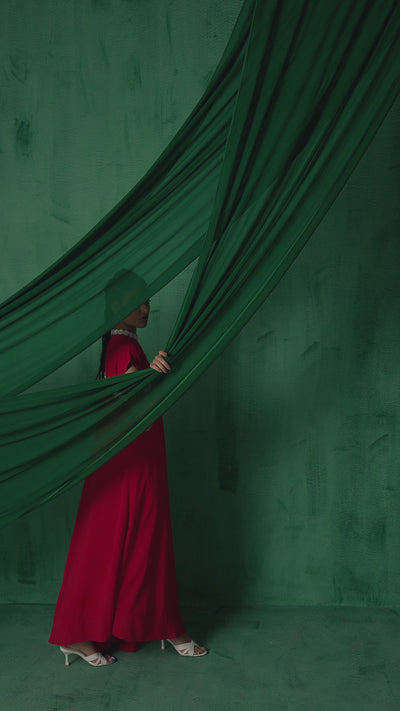 Designed with a flowing silhouette and a round neckline, this Gown ensemble features an elegant asymmetric drape for a contemporary yet graceful look.