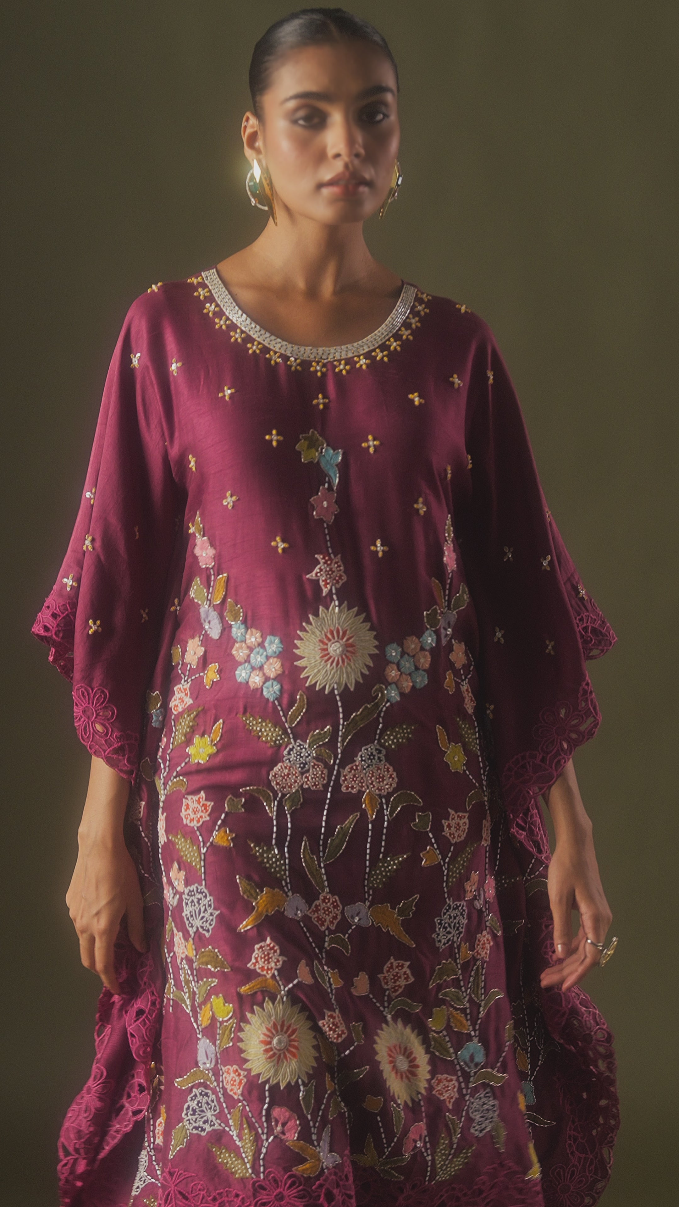 : The kaftan features a flowy, asymmetrical cut with wide sleeves, providing comfort while maintaining a chic look.