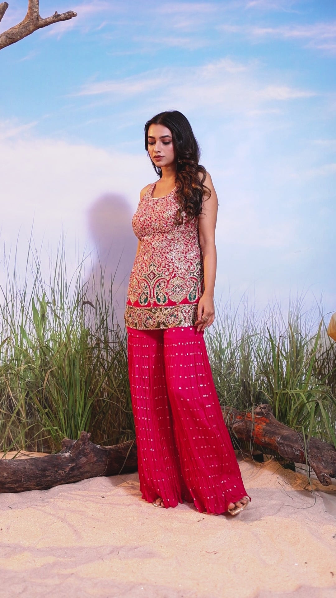 This is a vibrant Vibrant Pink sharara set featuring a heavily embellished, sleeveless Kurta paired with voluminous, pleated sharara pants.