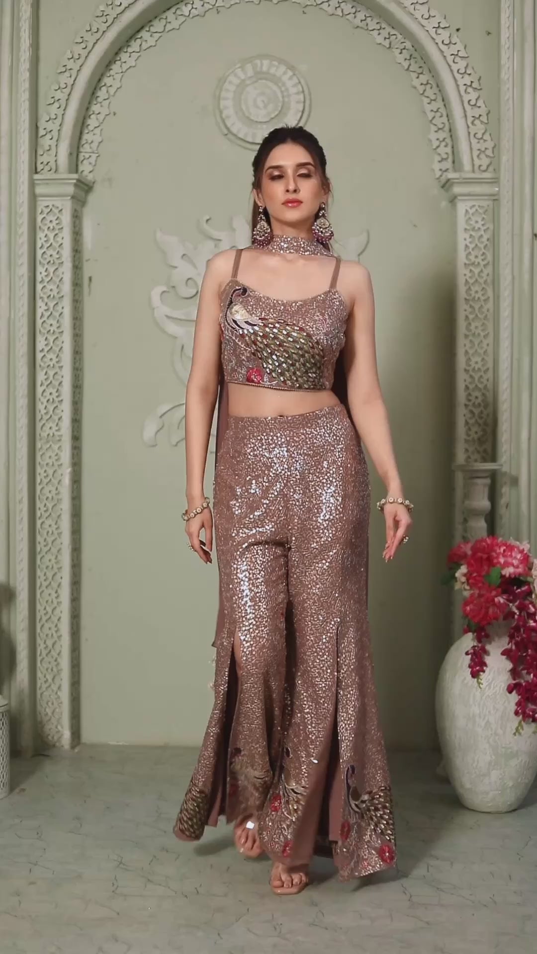 - Comes with a crop top, a front slit palazzo pant and a choker style dupatta.