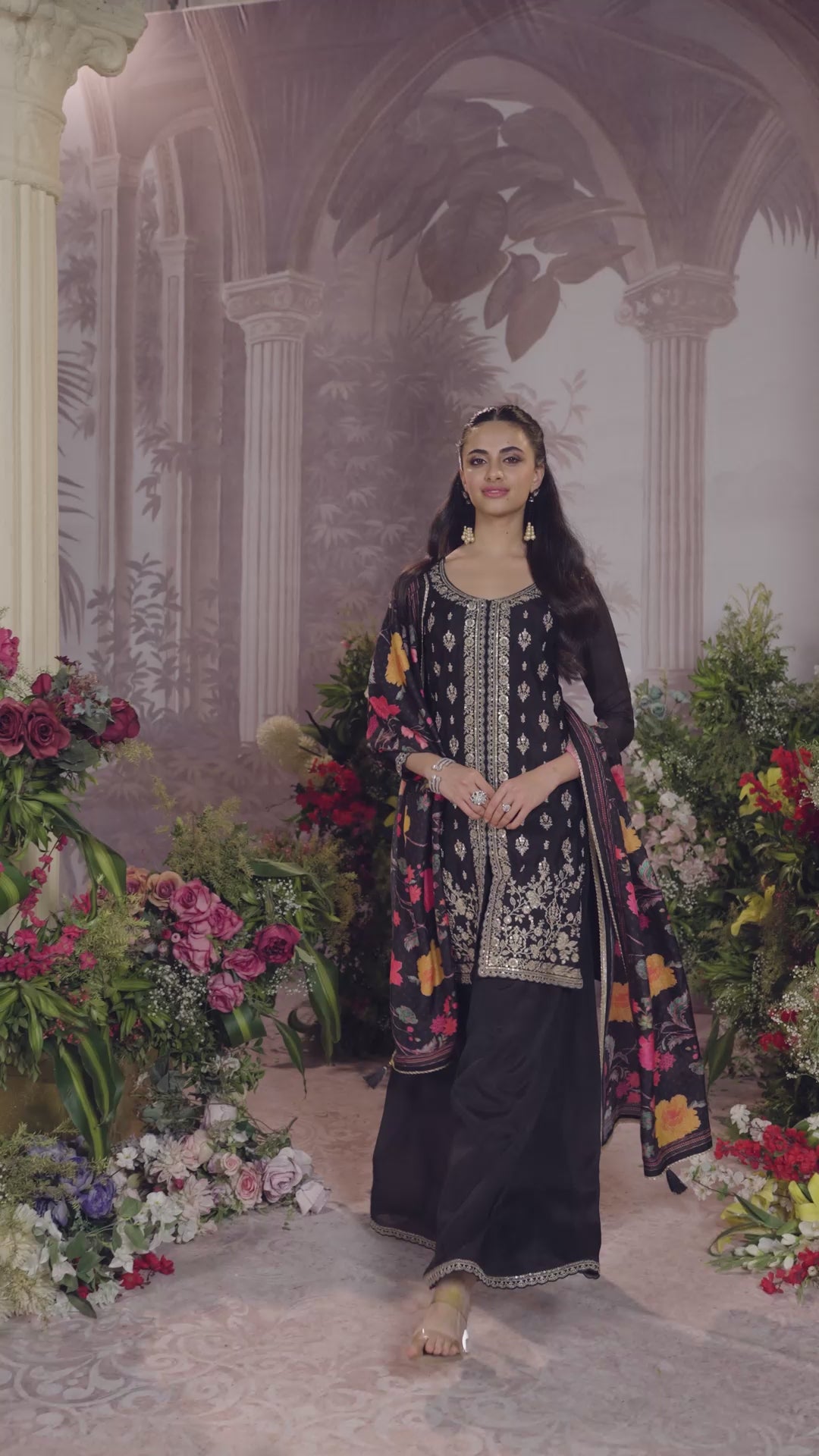 Embrace timeless elegance with this Deep Black Embellished Palazzo Set, thoughtfully crafted from luxurious Chinon Silk. The kurta features intricate hand embellishments using Cut Dana, Beads, Sequins, and Stones — showcasing fine traditional artistry.