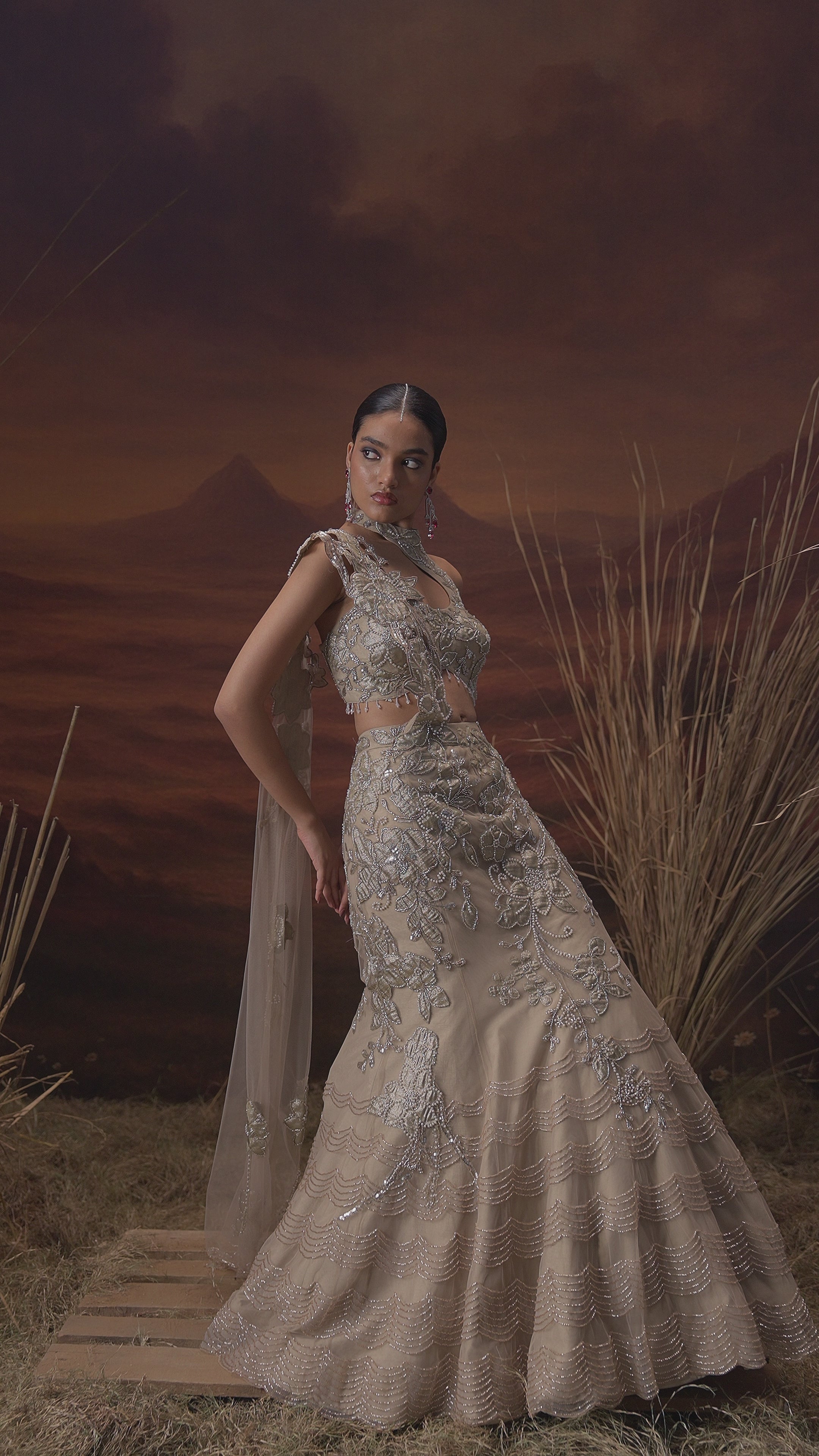 Step into a world of glamour with this enchanting Champagne Beige Lehenga Set. This two-piece ensemble features a beautifully hand-embroidered lehenga with a voluminous can-can underlay, creating a stunning silhouette. The intricate work, including cut dana, beads, and aari taari, flows seamlessly onto the statement blouse, which features a unique one-shoulder halter neck and an attached dupatta for an effortlessly elegant look.