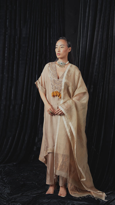 Grace your festivities with timeless sophistication in this elegant Champagne Gold Pant Set, crafted to reflect subtle opulence and regal charm.