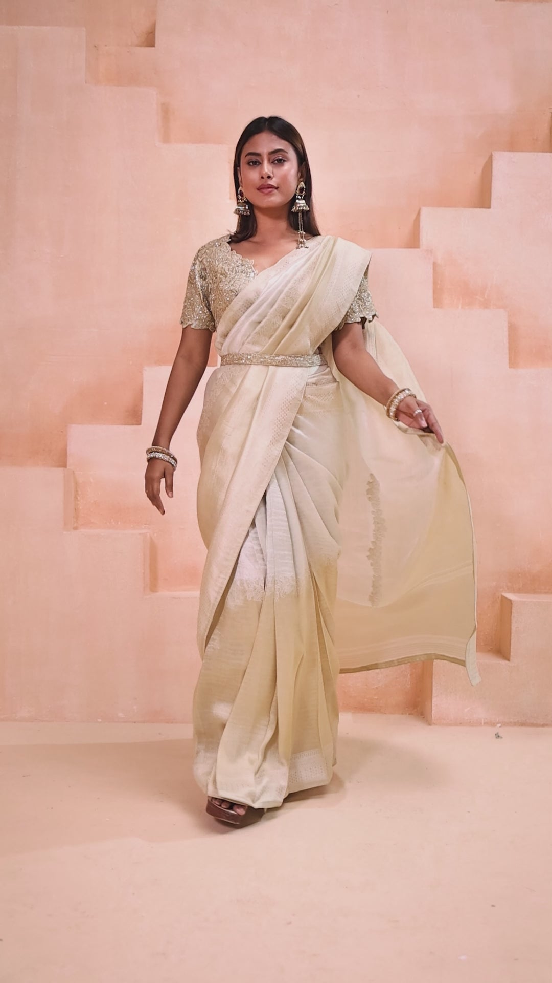 A luxurious ombré saree featuring a seamless transition from silver to gold with a high-shine metallic finish. Paired with a heavily embellished sequined blouse and a slim metallic belt, it offers a high-glamour, contemporary silhouette for evening festivities.