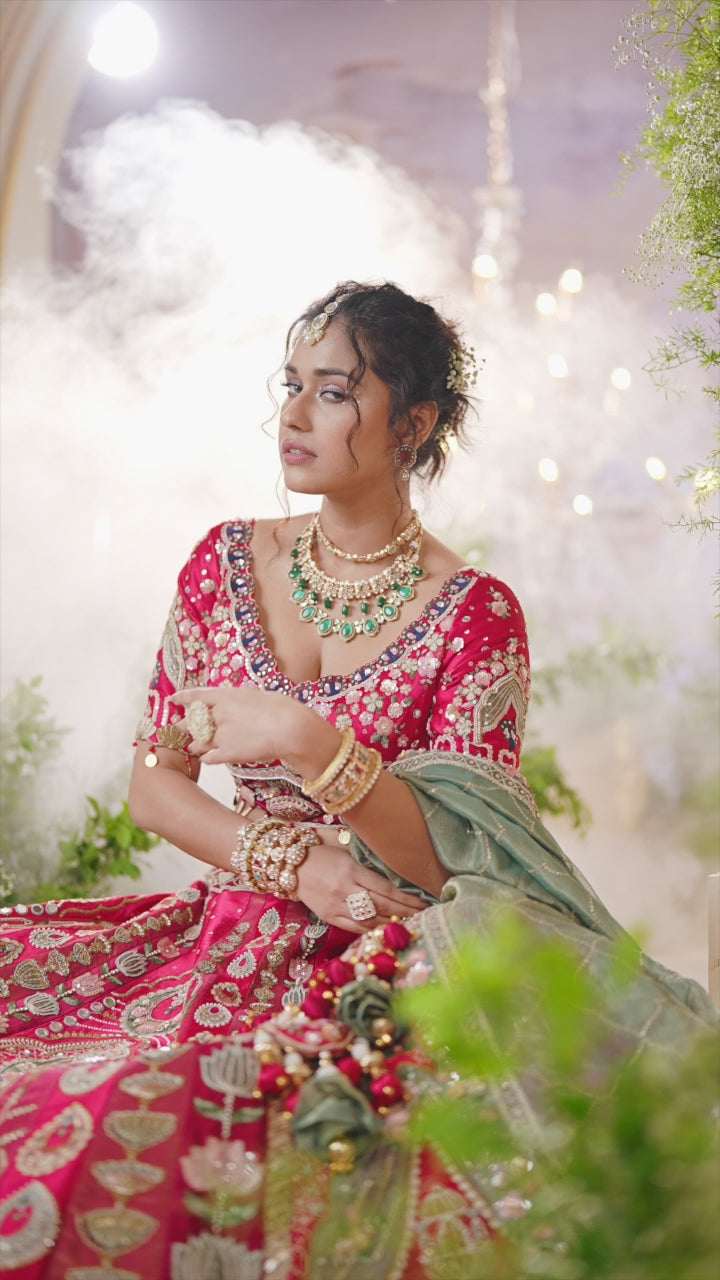 The Cherry Red Embellished Satin Silk Bridal Lehenga features intricate zardozi, stone, sequins, aari tari and bead handwork, creating a breathtaking design. It is paired with a matching unstitched blouse, enhancing its beauty. The ensemble is completed with a beautifully embellished green organza dupatta, adding a touch of elegance and contrast.