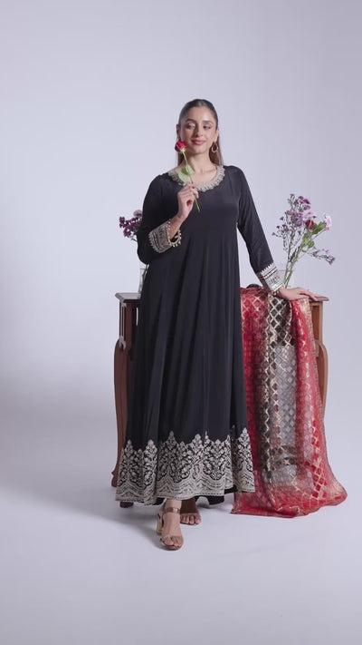 Anarkali Kurta : Luxurious crepe silk with a heavily embellished neckline, sleeve edges, and hemline, featuring sequins and golden thread work for a regal glow .