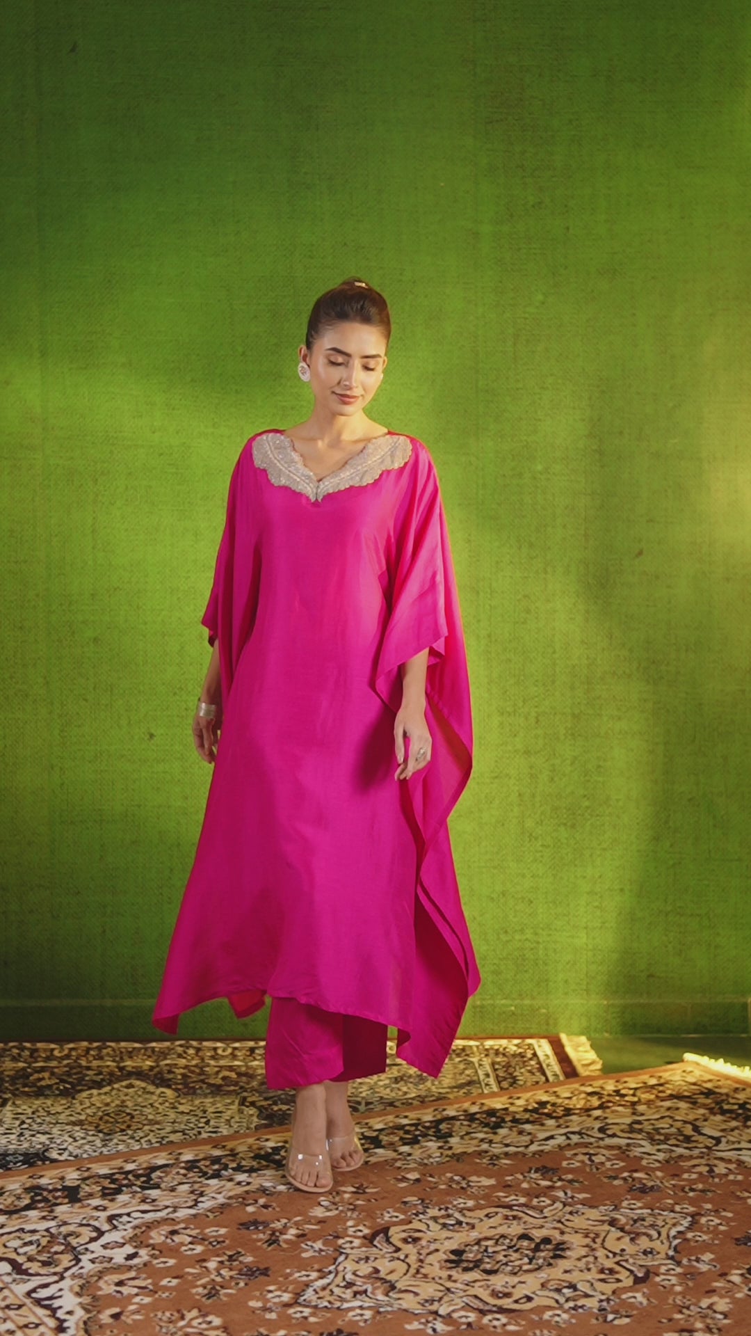 The Rani Pink embellished premium Raw Silk Kaftan Set. This outfit features sequin, zari work, handwork thread and cut dana work on its front. It is paired with matching solid pants. This ensemble is perfect for semi-formal wear, adding grace to your personality.
