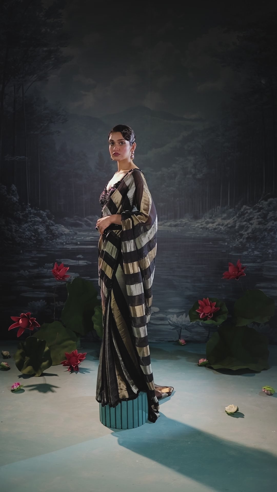 This striking drape saree is crafted from shimmer tissue silk fabric, featuring bold metallic stripes of gold and silver against a black backdrop for a glamorous, textured look.