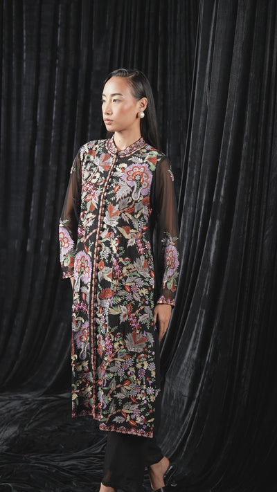 Make a sophisticated statement in this Classic Black Georgette Silk Kurta and Pant Set. The beautifully detailed thread embroidery creates a stunning floral tapestry against the black base, making this ensemble a timeless and elegant choice for any special occasion.
