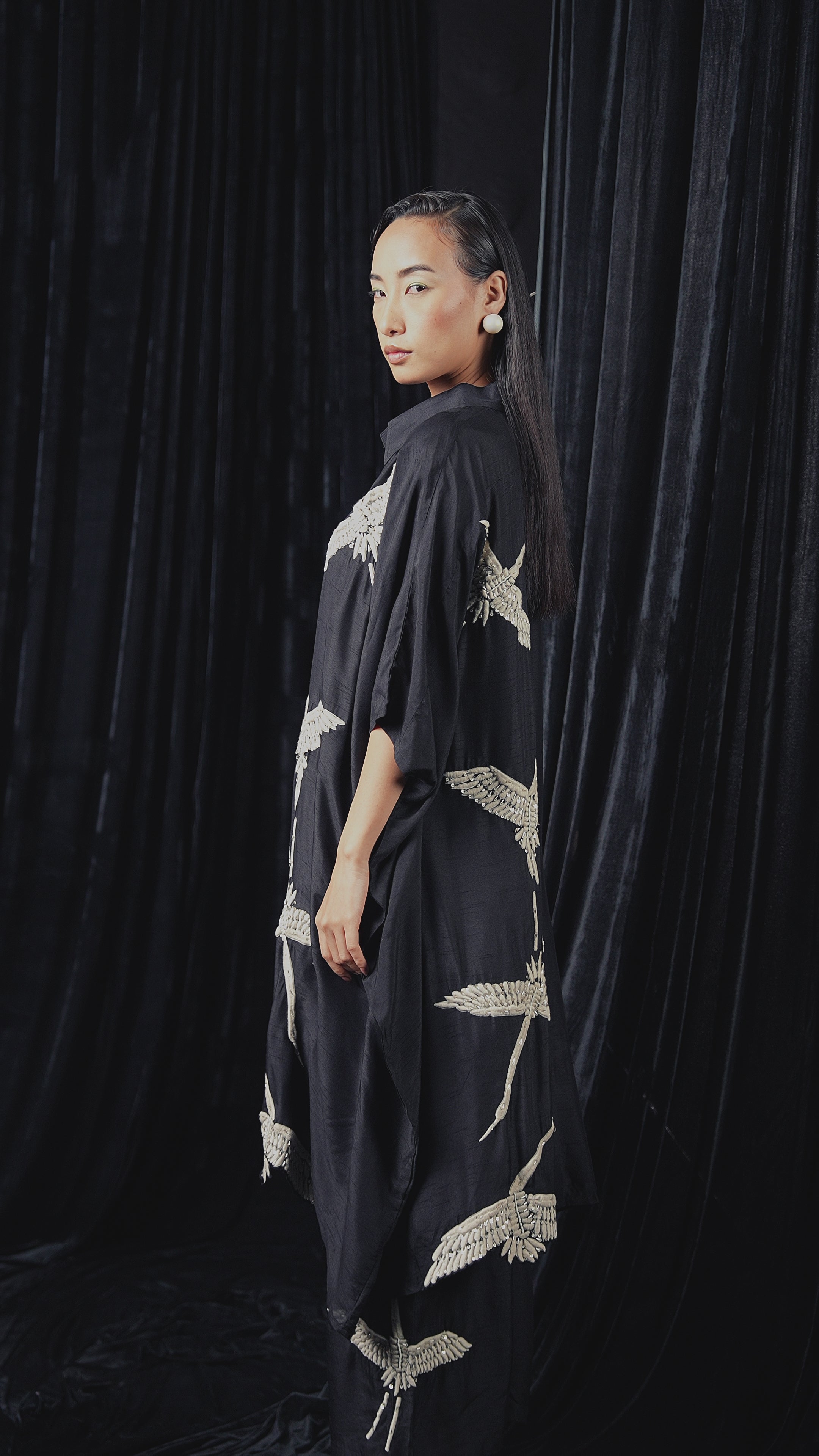 Step out in sophisticated style with this modern Classic Black Raw Silk Kaftan and Pants Set. The flowing kaftan is beautifully adorned with a chain of intricately hand-embroidered cranes, creating a graceful and artistic statement.