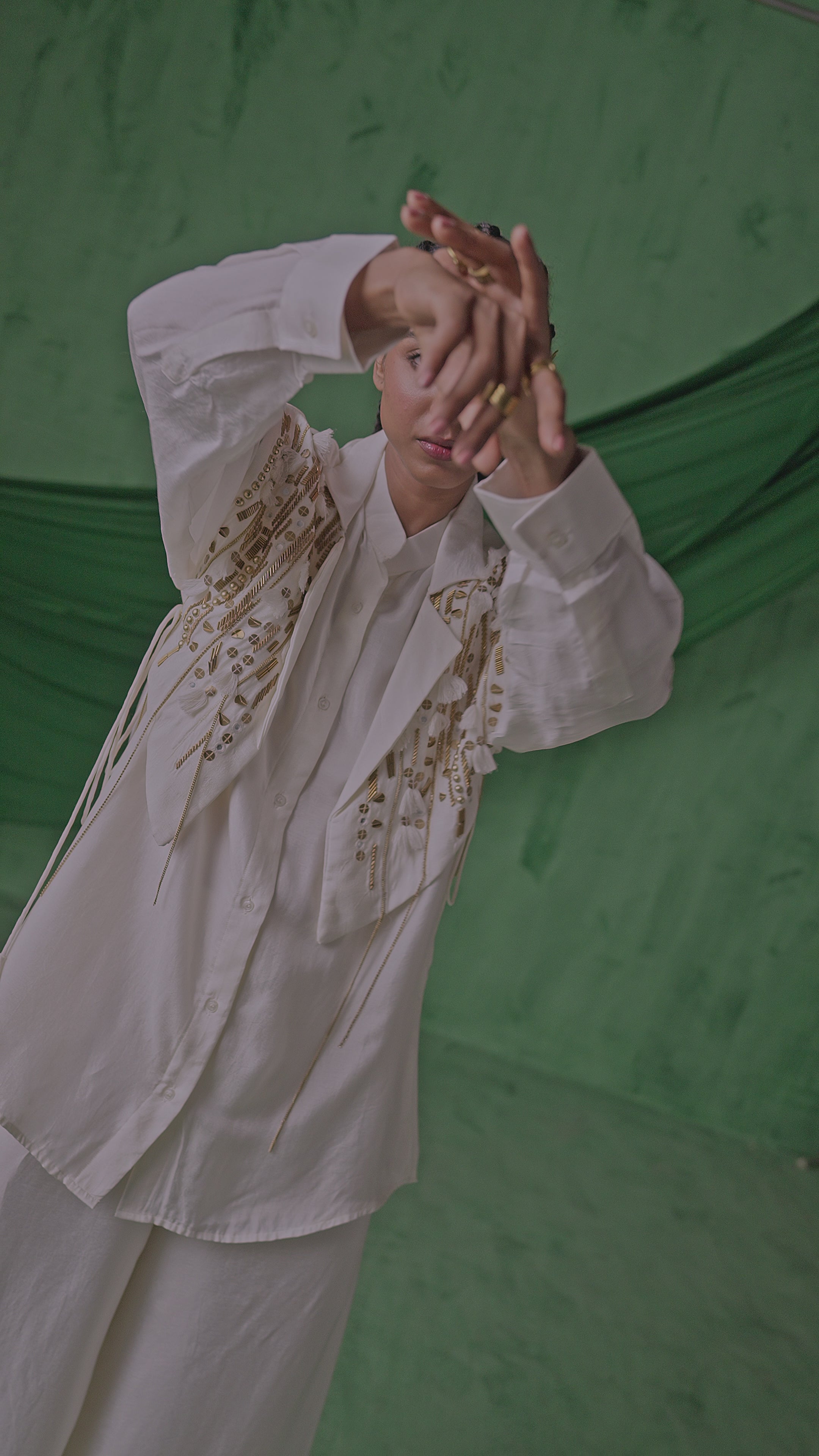 This chic Chinon silk co-Ord set features a stylish, tailored top paired with wide-leg pants for a sophisticated silhouette. The outfit is beautifully embellished with stone, mirror work, cut dana, and handcrafted thread tassels, creating an intricate, artistic design. Perfect for a modern yet elegant look, this set blends traditional craftsmanship with contemporary styling, ideal for both festive and evening wear.
