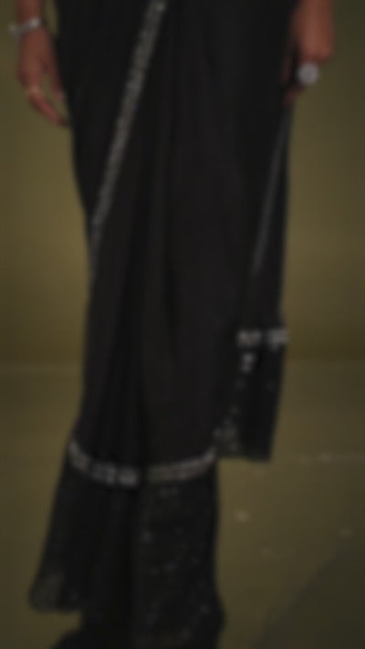 An elegant saree adorned with intricate embellishments, aari work and cut dana work that add depth and sophistication. The pallu is beautifully finished with a subtle tone-on-tone frill with sequins, which is echoed along the saree border for a graceful, refined look. The embellished blouse features stylish frill detailing on the sleeves , enhancing its charm.
