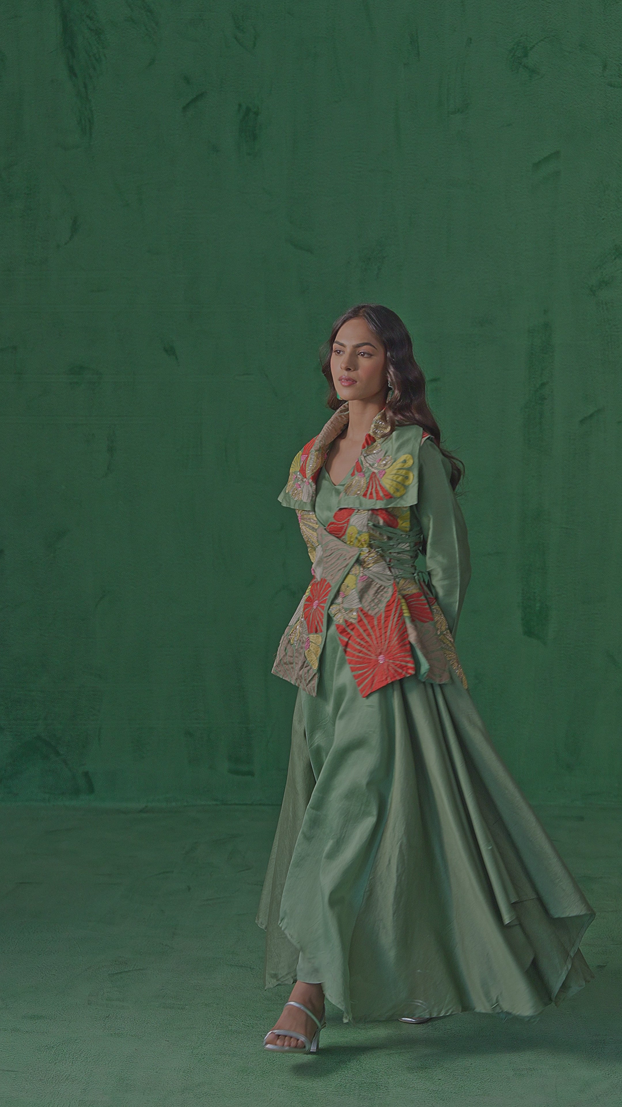 This elegant ensemble features a raw silk long tunic in a beautiful pistachio green shade, paired with a statement embroidered jacket. The jacket is intricately embellished with zari, sequins, and thread work, creating a vibrant and textural look. Subtle drawstrings on the sides add definition to the silhouette. Perfect for festive or contemporary occasions with a touch of artistic flair.