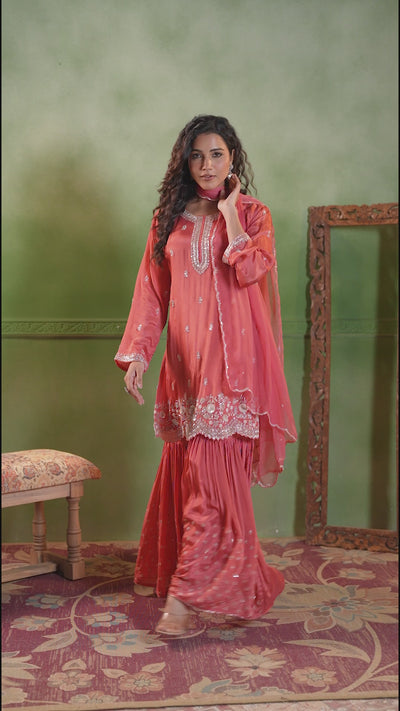 This majestic three-piece set is crafted from luxurious, pure Chinon Silk with a Coral Pink hue. The ensemble, featuring a kurti, sharara, and dupatta, is lavishly adorned with white-toned handwork, making it a sophisticated choice for any grand occasion.