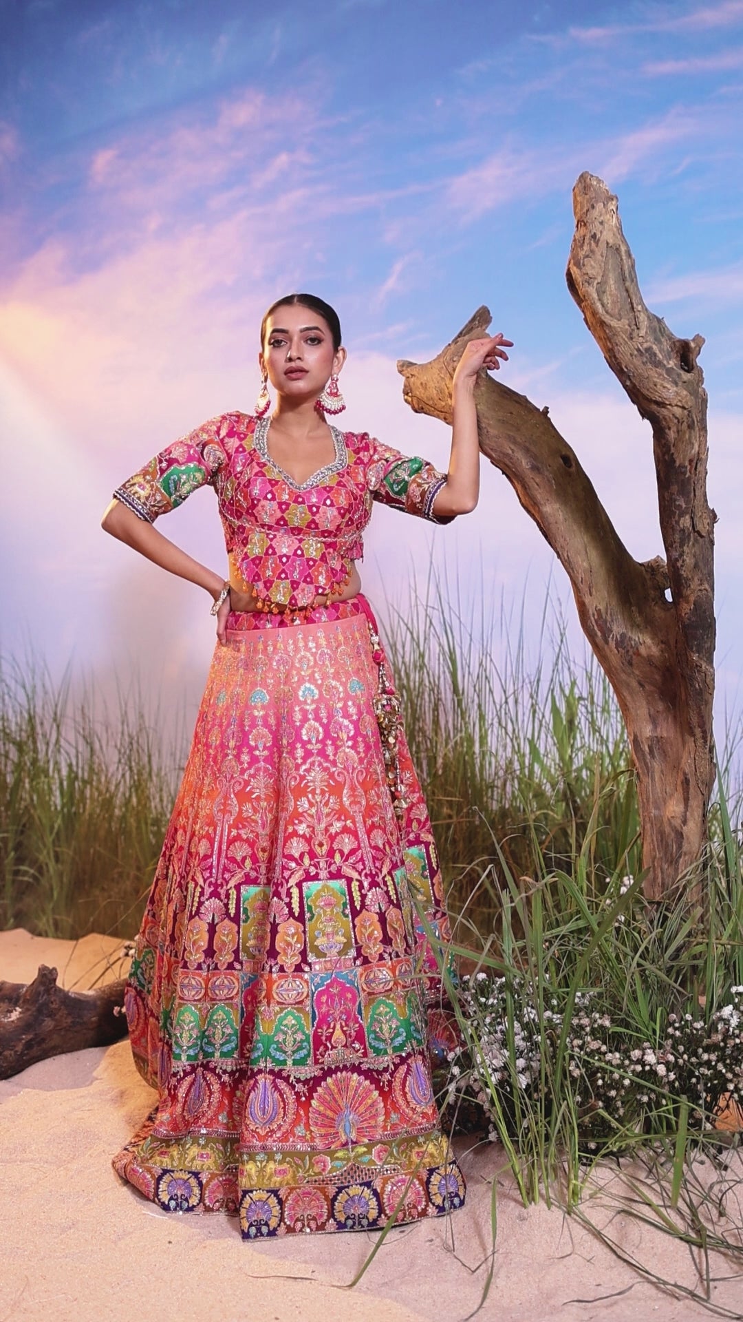 This dazzling two-piece ensemble is a feast of colors and intricate craftsmanship, making it an ideal choice for a grand festive, Sangeet, or bridal wear event. It features a heavily hand-embroidered Crop Top Blouse with a scalloped hem and elbow-length sleeves, paired with a voluminous Lehenga Skirt adorned with elaborate prints and panels of detailed embroidery.