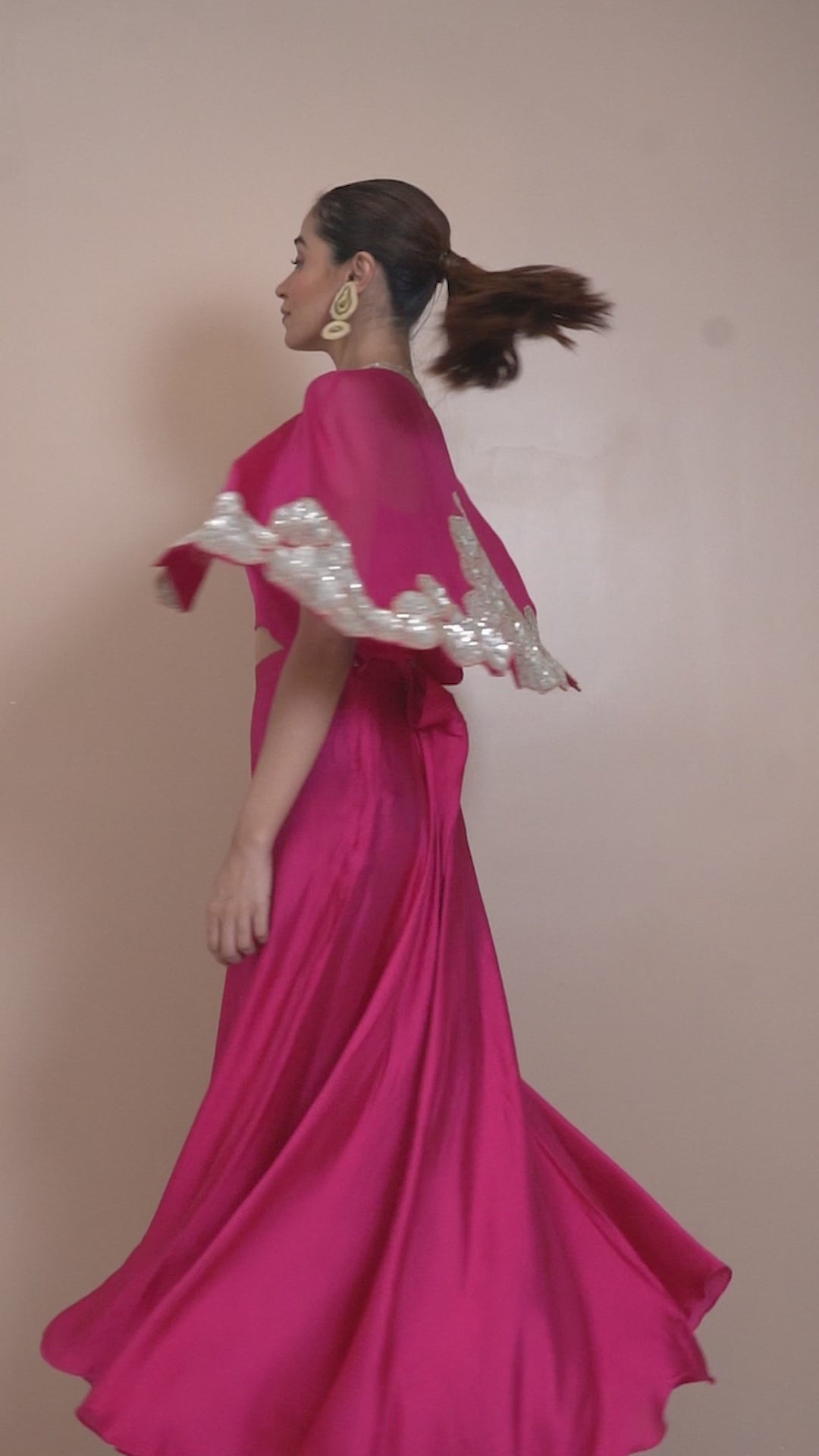 Dark pink embellished Italian silk palazzo set, featuring a designer outfit with intricate cut dana, thread, stone, sequins and zari handwork. The ensemble includes a stylish short cape layered over a solid crop top. Paired with matching flared solid palazzo pants for a graceful and modern silhouette. Rich embellishments lend a festive and luxurious appeal. Ideal for celebrations, festive gatherings, and special functions.