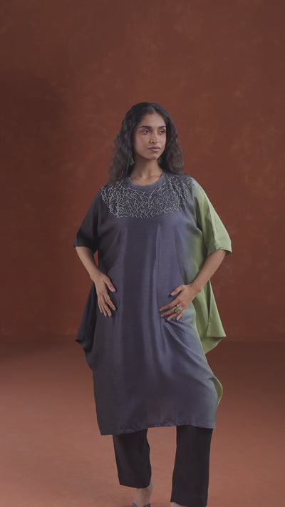 Make an effortlessly bold statement with this striking ombré kaftan set, crafted in luxurious raw silk. The flowy silhouette is elevated with intricate bead, cut dana, and hand embellishments around the neckline, adding a touch of modern artistry to its timeless appeal.