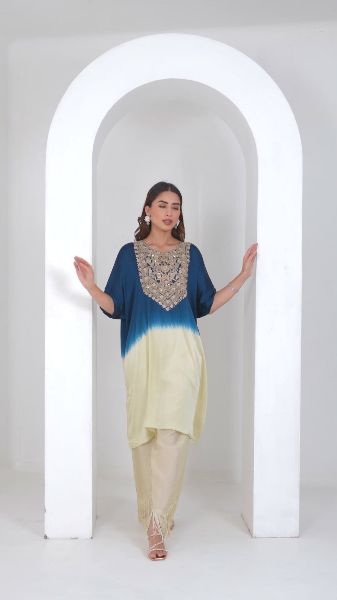 Introducing the Dark Blue Ombre-Dyed Satin Silk Kaftan Set. Featuring intricate sequin, aari, and zari handwork, the kaftan is paired with matching light beige raw silk palazzo styled with fringes at the bottom. Perfect for semi-formal wear.