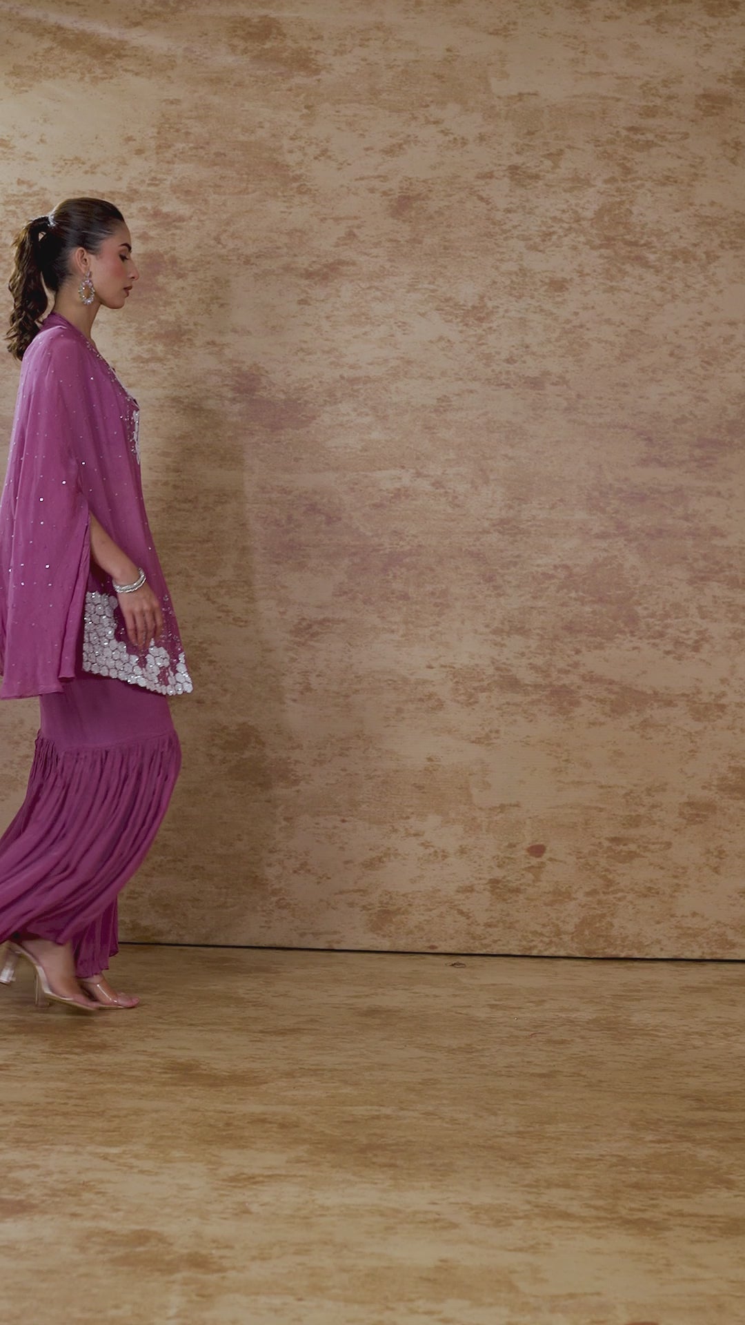 Introducing our stunning Dark Mauve Embroidered Chinon Silk Cape Set. This elegant ensemble features a beautifully crafted cape adorned with intricate sequin, mirror, and cut dana handwork. It comes with a matching inner and a solid sharara, making it perfect for semi-formal occasions.