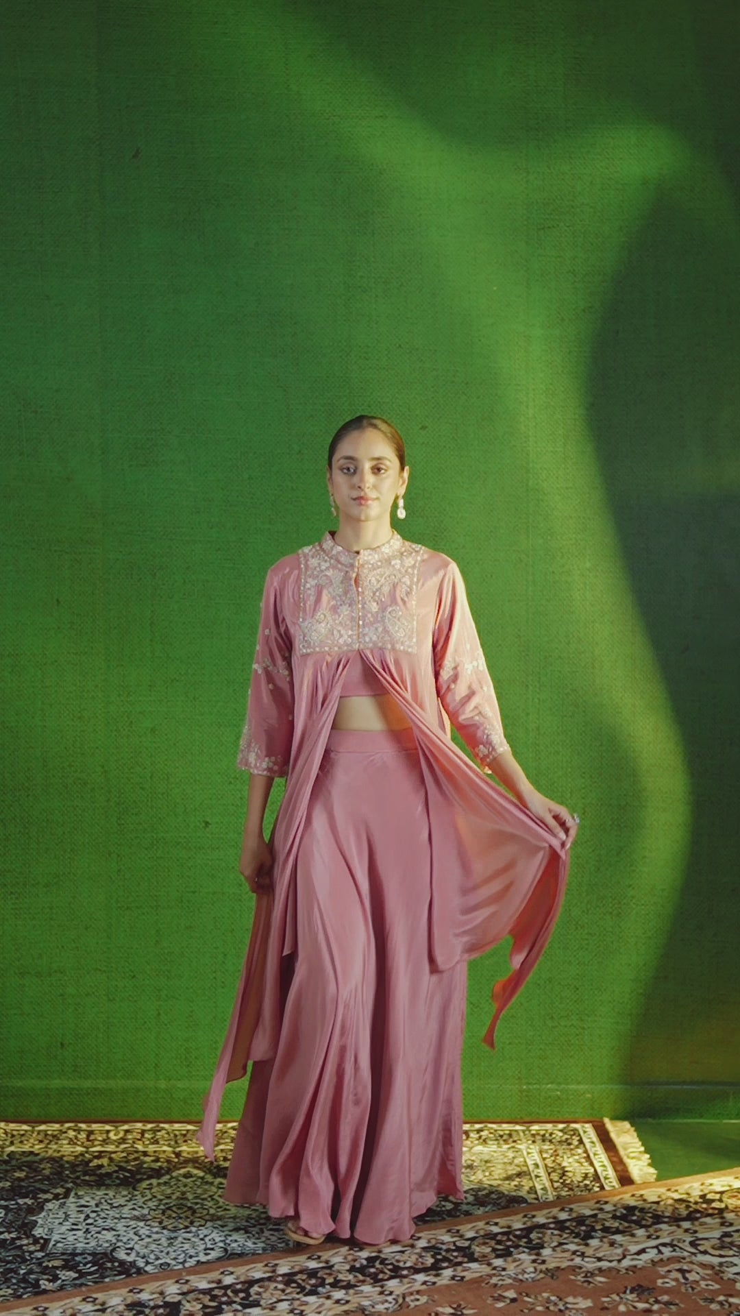 Elevate your style with this chic habutai silk skirt set. It comes with jacket featuring sequin, bead, cut-dana, thread work, aari-tari, and zari work. The skirt is paired with solid padded crop top. Enhance your wardrobe this festive season with this ensemble.