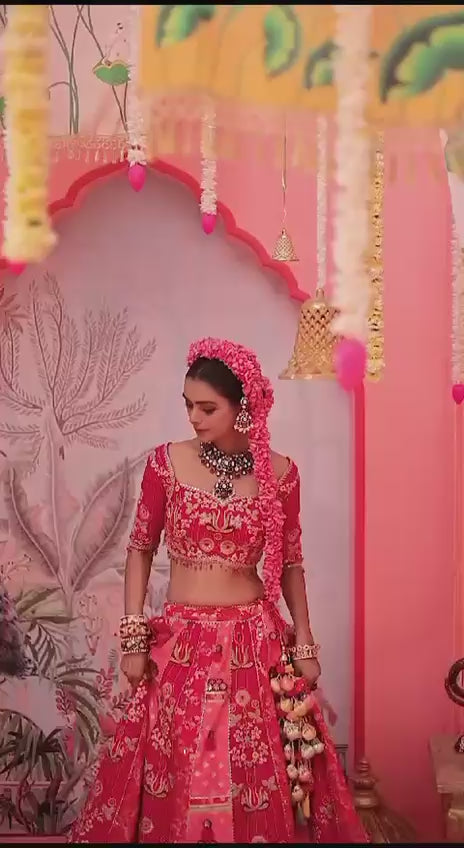 This Dark pink Embellished Banarasi silk lehenga set features exquisite beadwork, aari tari, zardozi, sequins, cut dana and zari handwork on the lehenga. It is complemented with an unstitch blouse and a beautifully matching dupatta, creating a perfect blend of tradition and luxury. The intricate embellishments and rich fabric make it an ideal choice for weddings and special occasions.