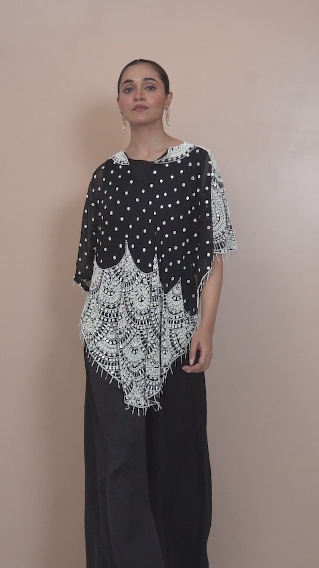 Premium black embellished georgette silk palazzo set, featuring a designer outfit with detailed cut dana, thread, stone, sequins and zari handwork. Styled with a poncho-style embellished cape layered over a solid crop top. Paired with matching flared solid palazzo pants for a sleek, contemporary silhouette. The luxurious detailing and flowing fabrics create an elegant festive look. Perfect for functions, celebrations and special occasions.