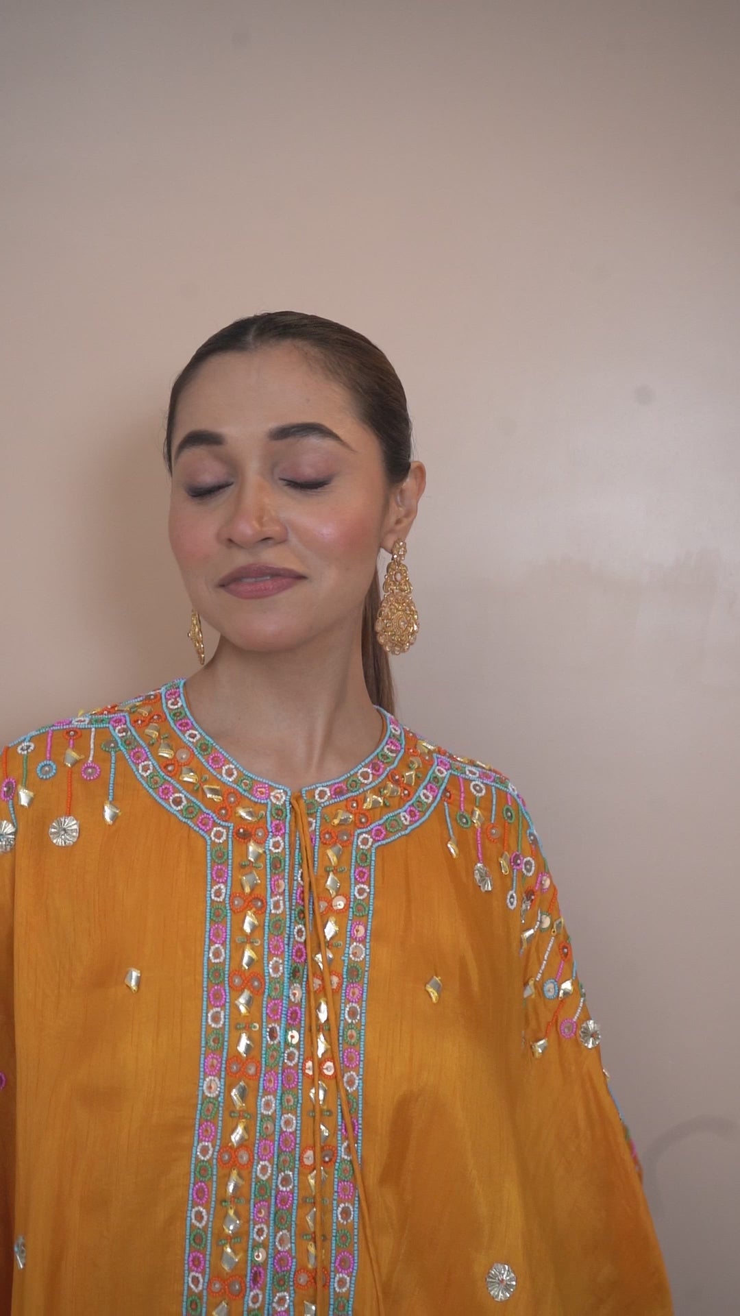 Glossy orange embellished pure Chinon silk co-Ord set, featuring a designer ensemble with delicate cut dana, thread, sequins and Zari handwork. The luxurious fabric and intricate detailing enhance its festive appeal. Paired with matching solid pants for a sleek and elegant look. This radiant outfit merges traditional craftsmanship with modern sophistication. Perfect for festivals, functions and celebratory parties.