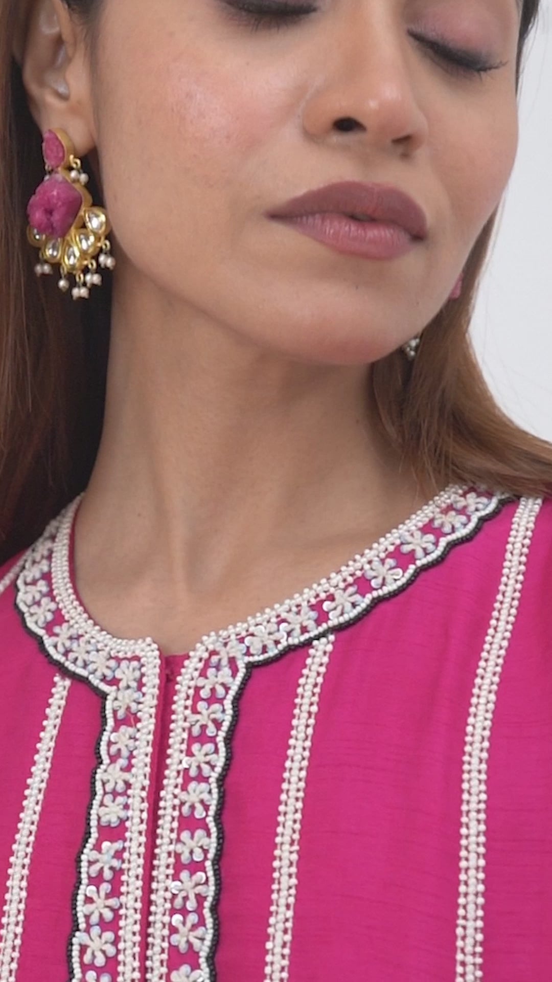 Cerise pink embellished Italian silk palazzo set, designed as a chic co-Ord ensemble with intricate cut dana, thread, stone, sequins, zari and pearl handwork. The designer top features beautifully embellished sleeves that add a touch of elegance and detail. Paired with matching solid palazzo pants for a refined and flattering silhouette. This vibrant outfit blends festive glamour with modern sophistication. Perfect for festive occasions, parties and special functions.