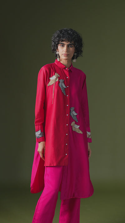Make a playful yet powerful statement in this unique Dual-Toned Red & Fuchsia Set. This two-piece ensemble features a stylish, asymmetrical raw silk shirt beautifully adorned with intricate hand-embroidered bird patches. The look is completed with a pair of perfectly matched pants, creating a cohesive and eye-catching look.
