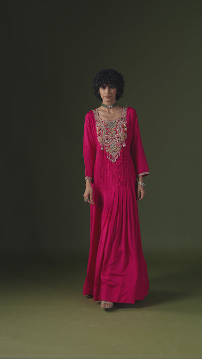 Command attention in this stunning Dark Pink Raw Silk Gown. This single-piece gown features an elegant A-line silhouette with a smocked and pleated bodice. The yoke is a spectacular focal point, exquisitely embellished with intricate zari, bead, thread, and sequin handwork in a beautiful multi-colored design.