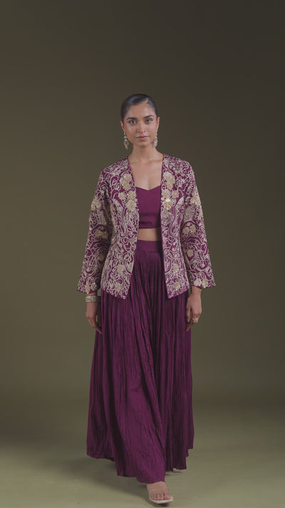 Make a regal entrance with this Dark Purple Embellished Premium Silk Palazzo Set—where dramatic detailing meets effortless elegance in a silhouette that speaks celebration.
