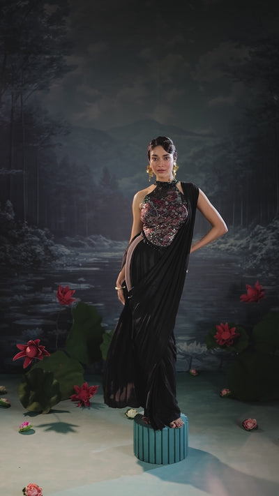 This striking ensemble features a classic black drape saree crafted from smooth satin silk fabric, giving it an elegant, flowing silhouette.