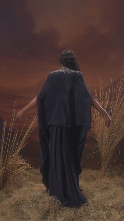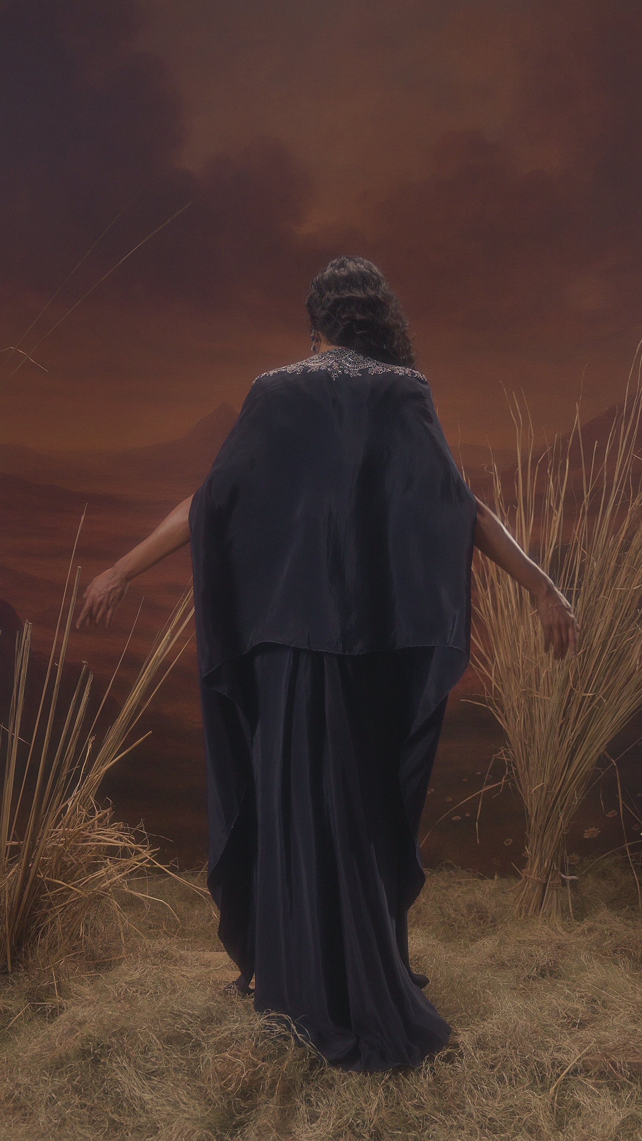 Deep Blue Embellished Satin Silk Cape Skirt Set