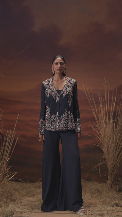 Make a bold and sophisticated statement with this Ink Blue Georgette Silk Co-Ord Set, featuring an intricately embellished jacket and a comfortable inner and palazzo.