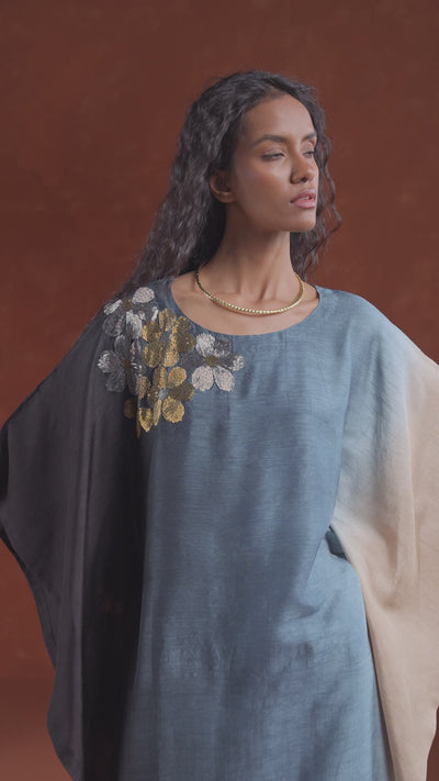 This ombré kaftan set is crafted from luxurious raw silk, showcasing a seamless gradient from deep blue to cream. The neckline is adorned with intricate cut dhana and delicate handwork, adding a touch of artisanal elegance. Its flowing silhouette and rich texture make it a perfect blend of tradition and contemporary style.