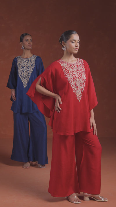 Deep Blue Embellished Raw Silk Kaftan Set