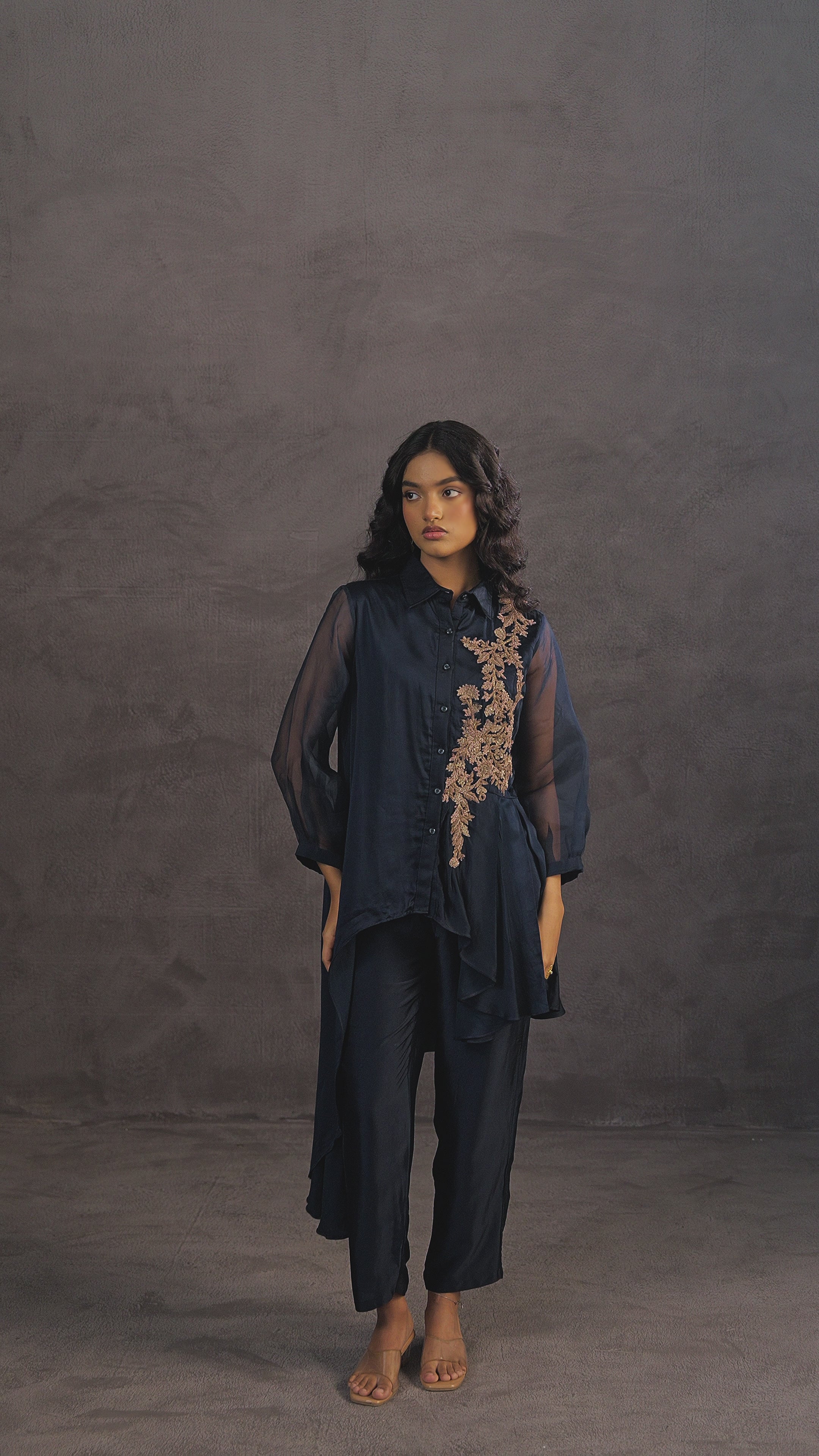 Perfect for evening events or festive occasions, this set balances modern fluidity with traditional craftsmanship.