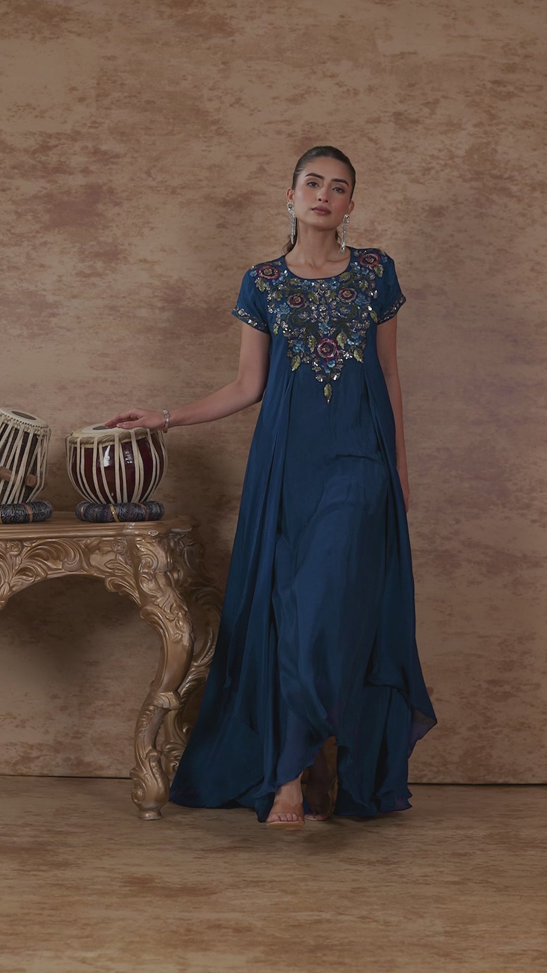 Introducing our Deep Blue Embroidered Chinon Silk Draped Gown. This stunning piece features a beautifully padded draped design, crafted from luxurious chinon silk. Adorned with intricate handwork, including sequins, beads, and cut dana, it exudes elegance and sophistication. Perfect for semi-formal occasions, this gown is sure to make a statement.