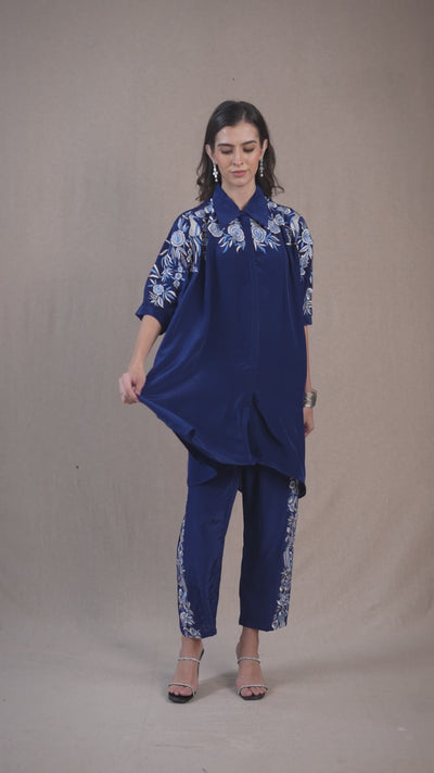 Introducing our Deep Blue Embroidered Crepe Silk Co-Ord Set. Featuring a shirt kaftan with intricate floral handwork, paired with matching pants. Perfect for semi-formal wear.