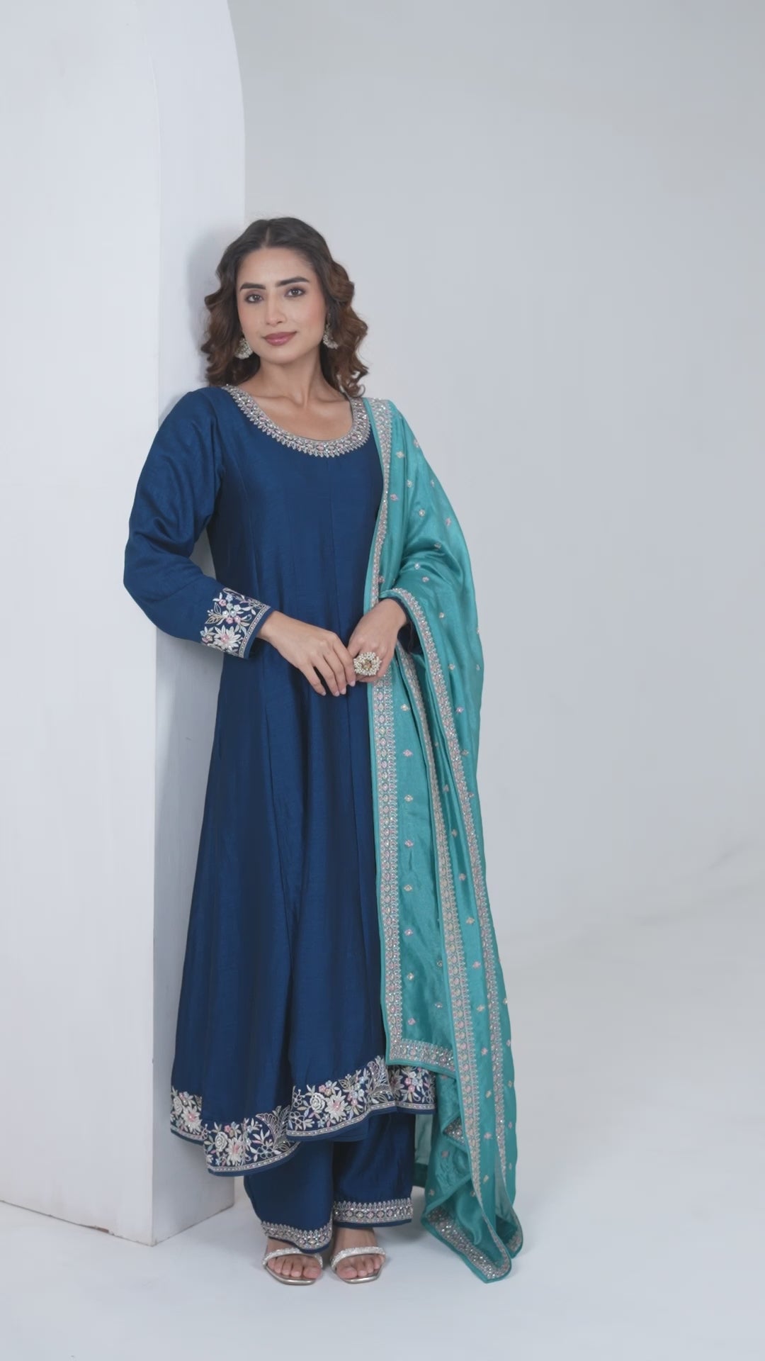 Deep Blue Embroidered Premium Silk Anarkali Set
